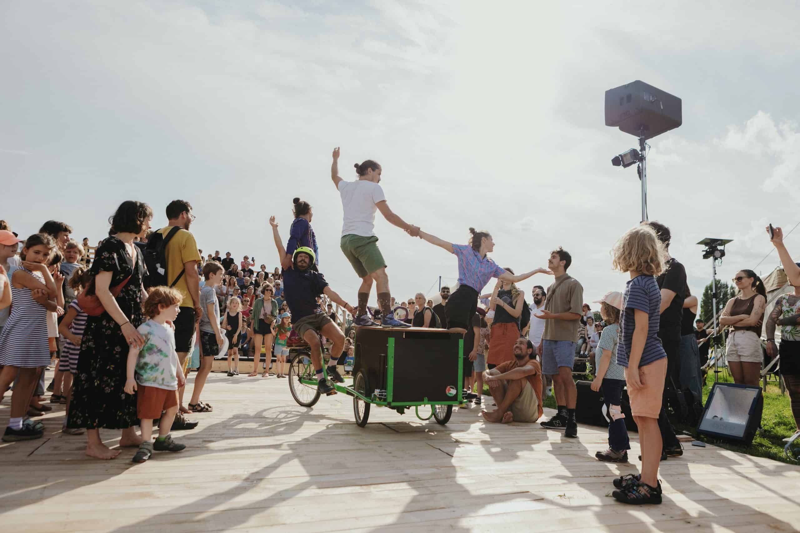 De voorstelling Kiss&Fly is een uitnodiging om de openbare ruimte opnieuw te omarmen als een plek van samenzijn en spel. Vier acrobaten komen aan met hun driewielers, een wip en de drang om hoogte te winnen, op elkaars schouders te klimmen en zich boven de menigte uit te stijgen. De energie stijgt op en de menigte wordt meegesleept in een vluchtige ervaring die samen beleefd wordt. Een gesmaakte mix van circus, acrobatie en humor.